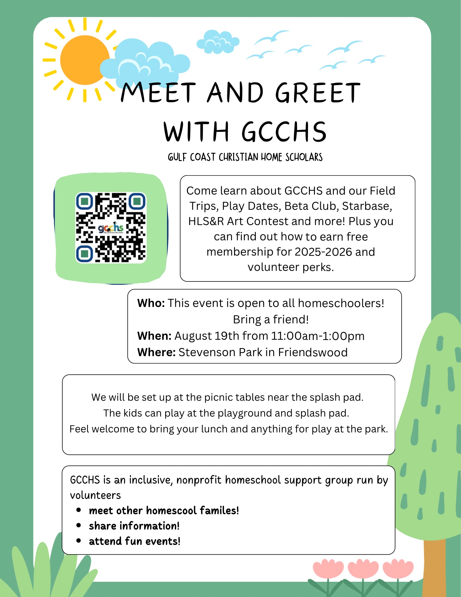 What: Come learn about GCCHS and our Field Trips, Play Dates, Beta Club, Starbase, HLS&R Art Contest and more! Plus you can find out how to earn free membership for 2025-2026 and volunteer perks.